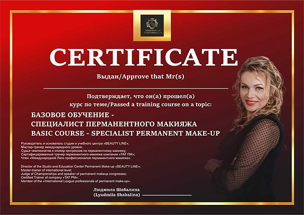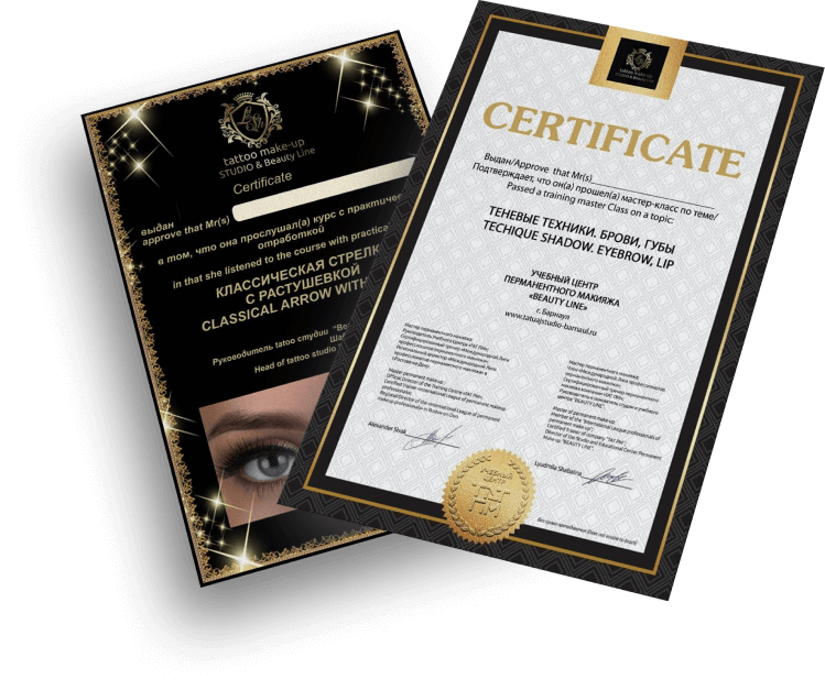 По окончании курса выдаются СВИДЕТЕЛЬСТВО об образовании установленного образца, 2 сертификата меж.образца. Компании ТАТ ПМ (Образовательная лицензия 6761) и Учебного центра BEAUTY LINE!
